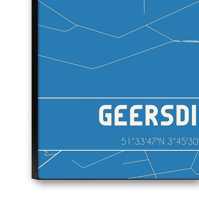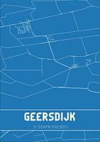 Blauwdruk van de landkaart / plattegrond van de Nederlandse plaats Geersdijk, gelegen in gemeente Noord-Beveland, provincie Zeeland. De kaart bevat alle openbare wegen en de coördinaten van het centrum van Geersdijk.