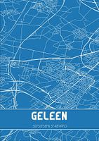 Blauwdruk van de landkaart / plattegrond van de Nederlandse plaats Geleen, gelegen in gemeente Sittard-Geleen, provincie Limburg. De kaart bevat alle openbare wegen en de coördinaten van het centrum van Geleen.