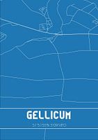Blauwdruk van de landkaart / plattegrond van de Nederlandse plaats Gellicum, gelegen in de Betuwe, in gemeente West Betuwe, provincie Gelderland. De kaart bevat alle openbare wegen en de coördinaten van het centrum van Gellicum.