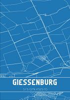 Blauwdruk van de landkaart / plattegrond van de Nederlandse plaats Giessenburg, gelegen in gemeente Molenlanden, provincie Zuid-Holland. De kaart bevat alle openbare wegen en de coördinaten van het centrum van Giessenburg.