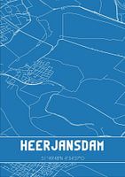 Blauwdruk van de landkaart / plattegrond van de Nederlandse plaats Heerjansdam, gelegen in gemeente Zwijndrecht, provincie Zuid-Holland. De kaart bevat alle openbare wegen en de coördinaten van het centrum van Heerjansdam.