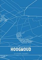 Blauwdruk van de landkaart / plattegrond van de Nederlandse plaats Hoogwoud, gelegen in gemeente Opmeer, provincie Noord-Holland. De kaart bevat alle openbare wegen en de coördinaten van het centrum van Hoogwoud.