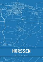 Blauwdruk van de landkaart / plattegrond van de Nederlandse plaats Horssen, gelegen in regio Rivierenland, in gemeente Druten, provincie Gelderland. De kaart bevat alle openbare wegen en de coördinaten van het centrum van Horssen.