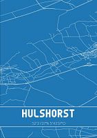 Blauwdruk van de landkaart / plattegrond van de Nederlandse plaats Hulshorst, gelegen op de Veluwe, in gemeente Nunspeet, provincie Gelderland. De kaart bevat alle openbare wegen en de coördinaten van het centrum van Hulshorst.