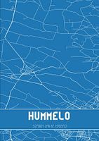 Blauwdruk van de landkaart / plattegrond van de Nederlandse plaats Hummelo, gelegen in de Achterhoek, in gemeente Bronckhorst, provincie Gelderland. De kaart bevat alle openbare wegen en de coördinaten van het centrum van Hummelo.