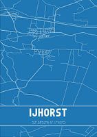 Blauwdruk van de landkaart / plattegrond van de Nederlandse plaats IJhorst, gelegen in gemeente Staphorst, provincie Overijssel. De kaart bevat alle openbare wegen en de coördinaten van het centrum van IJhorst.
