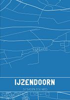 Blauwdruk van de landkaart / plattegrond van de Nederlandse plaats IJzendoorn, gelegen in de Betuwe, in gemeente Neder-Betuwe, provincie Gelderland. De kaart bevat alle openbare wegen en de coördinaten van het centrum van IJzendoorn.