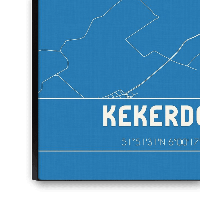 Blauwdruk van de landkaart / plattegrond van de Nederlandse plaats Kekerdom, gelegen in regio Rivierenland, in gemeente Berg en Dal, provincie Gelderland. De kaart bevat alle openbare wegen en de coördinaten van het centrum van Kekerdom.