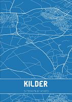 Blauwdruk van de landkaart / plattegrond van de Nederlandse plaats Kilder, gelegen in de Liemers, in gemeente Montferland, provincie Gelderland. De kaart bevat alle openbare wegen en de coördinaten van het centrum van Kilder.