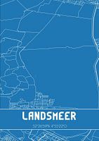 Blauwdruk van de landkaart / plattegrond van de Nederlandse plaats Landsmeer, gelegen in gemeente Landsmeer, provincie Noord-Holland. De kaart bevat alle openbare wegen en de coördinaten van het centrum van Landsmeer.