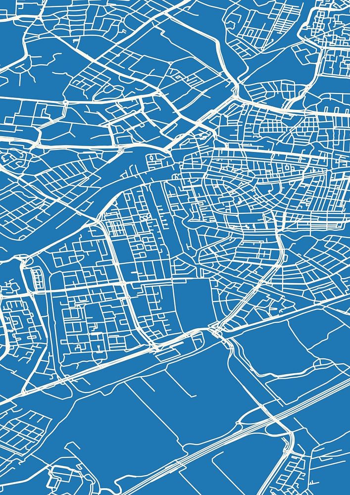 Blauwdruk van de landkaart / plattegrond van de Nederlandse plaats Leiden, gelegen in gemeente Leiden, provincie Zuid-Holland. De kaart bevat alle openbare wegen en de coördinaten van het centrum van Leiden.