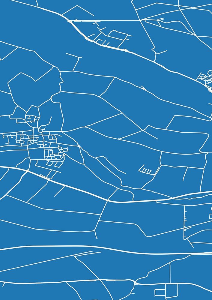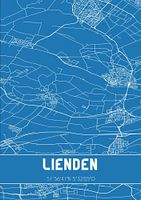 Blauwdruk van de landkaart / plattegrond van de Nederlandse plaats Lienden, gelegen in de Betuwe, in gemeente Buren, provincie Gelderland. De kaart bevat alle openbare wegen en de coördinaten van het centrum van Lienden.