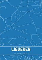 Blauwdruk van de landkaart / plattegrond van de Nederlandse plaats Lieveren, gelegen in gemeente Noordenveld, provincie Drenthe. De kaart bevat alle openbare wegen en de coördinaten van het centrum van Lieveren.