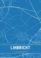 Blauwdruk van de landkaart / plattegrond van de Nederlandse plaats Limbricht, gelegen in gemeente Sittard-Geleen, provincie Limburg. De kaart bevat alle openbare wegen en de coördinaten van het centrum van Limbricht.