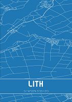 Blauwdruk van de landkaart / plattegrond van de Nederlandse plaats Lith, gelegen in gemeente Oss, provincie Noord-Brabant. De kaart bevat alle openbare wegen en de coördinaten van het centrum van Lith.