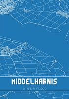 Blauwdruk van de landkaart / plattegrond van de Nederlandse plaats Middelharnis, gelegen in gemeente Goeree-Overflakkee, provincie Zuid-Holland. De kaart bevat alle openbare wegen en de coördinaten van het centrum van Middelharnis.