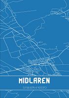 Blauwdruk van de landkaart / plattegrond van de Nederlandse plaats Midlaren, gelegen in gemeente Tynaarlo, provincie Drenthe. De kaart bevat alle openbare wegen en de coördinaten van het centrum van Midlaren.