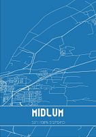 Blauwdruk van de landkaart / plattegrond van de Nederlandse plaats Midlum, gelegen in gemeente Harlingen, provincie Fryslan. De kaart bevat alle openbare wegen en de coördinaten van het centrum van Midlum.