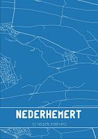 Blauwdruk van de landkaart / plattegrond van de Nederlandse plaats Nederhemert, gelegen in de Betuwe, in gemeente Zaltbommel, provincie Gelderland. De kaart bevat alle openbare wegen en de coördinaten van het centrum van Nederhemert.