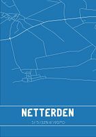 Blauwdruk van de landkaart / plattegrond van de Nederlandse plaats Netterden, gelegen in de Liemers, in gemeente Oude IJsselstreek, provincie Gelderland. De kaart bevat alle openbare wegen en de coördinaten van het centrum van Netterden.