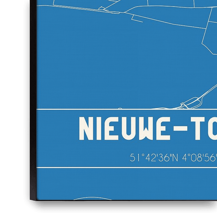 Blauwdruk van de landkaart / plattegrond van de Nederlandse plaats Nieuwe-Tonge, gelegen in gemeente Goeree-Overflakkee, provincie Zuid-Holland. De kaart bevat alle openbare wegen en de coördinaten van het centrum van Nieuwe-Tonge.