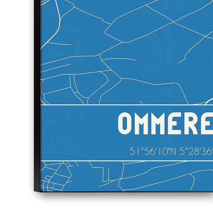 Blauwdruk van de landkaart / plattegrond van de Nederlandse plaats Ommeren, gelegen in de Betuwe, in gemeente Buren, provincie Gelderland. De kaart bevat alle openbare wegen en de coördinaten van het centrum van Ommeren.