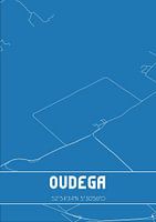 Blauwdruk van de landkaart / plattegrond van de Nederlandse plaats Oudega, gelegen in gemeente De Fryske Marren, provincie Fryslan. De kaart bevat alle openbare wegen en de coördinaten van het centrum van Oudega.