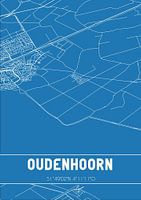 Blauwdruk van de landkaart / plattegrond van de Nederlandse plaats Oudenhoorn, gelegen in gemeente Hellevoetsluis, provincie Zuid-Holland. De kaart bevat alle openbare wegen en de coördinaten van het centrum van Oudenhoorn.