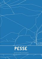 Blauwdruk van de landkaart / plattegrond van de Nederlandse plaats Pesse, gelegen in gemeente Westerveld, provincie Drenthe. De kaart bevat alle openbare wegen en de coördinaten van het centrum van Pesse.