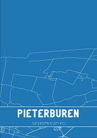 Blauwdruk van de landkaart / plattegrond van de Nederlandse plaats Pieterburen, gelegen in gemeente Het Hogeland, provincie Groningen. De kaart bevat alle openbare wegen en de coördinaten van het centrum van Pieterburen.