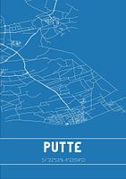 Blauwdruk van de landkaart / plattegrond van de Nederlandse plaats Putte, gelegen in gemeente Woensdrecht, provincie Noord-Brabant. De kaart bevat alle openbare wegen en de coördinaten van het centrum van Putte.