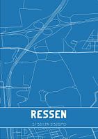 Blauwdruk van de landkaart / plattegrond van de Nederlandse plaats Ressen, gelegen in de Betuwe, in gemeente Lingewaard, provincie Gelderland. De kaart bevat alle openbare wegen en de coördinaten van het centrum van Ressen.
