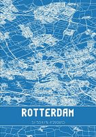Blauwdruk van de landkaart / plattegrond van de Nederlandse plaats Rotterdam, gelegen in de Randstad, in gemeente Rotterdam, provincie Zuid-Holland. De kaart bevat alle openbare wegen en de coördinaten van het centrum van Rotterdam.