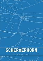 Blauwdruk van de landkaart / plattegrond van de Nederlandse plaats Schermerhorn, gelegen in gemeente Alkmaar, provincie Noord-Holland. De kaart bevat alle openbare wegen en de coördinaten van het centrum van Schermerhorn.