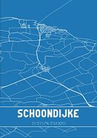 Blauwdruk van de landkaart / plattegrond van de Nederlandse plaats Schoondijke, gelegen in gemeente Sluis, provincie Zeeland. De kaart bevat alle openbare wegen en de coördinaten van het centrum van Schoondijke.