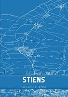 Blauwdruk van de landkaart / plattegrond van de Nederlandse plaats Stiens, gelegen in gemeente Leeuwarden, provincie Fryslan. De kaart bevat alle openbare wegen en de coördinaten van het centrum van Stiens.