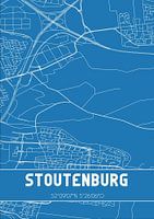 Blauwdruk van de landkaart / plattegrond van de Nederlandse plaats Stoutenburg, gelegen in gemeente Leusden, provincie Utrecht. De kaart bevat alle openbare wegen en de coördinaten van het centrum van Stoutenburg.