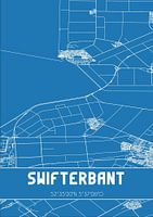 Blauwdruk van de landkaart / plattegrond van de Nederlandse plaats Swifterbant, gelegen in gemeente Dronten, provincie Flevoland. De kaart bevat alle openbare wegen en de coördinaten van het centrum van Swifterbant.