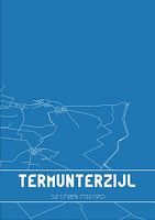 Blauwdruk van de landkaart / plattegrond van de Nederlandse plaats Termunterzijl, gelegen in gemeente Delfzijl, provincie Groningen. De kaart bevat alle openbare wegen en de coördinaten van het centrum van Termunterzijl.