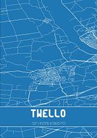 Blauwdruk van de landkaart / plattegrond van de Nederlandse plaats Twello, gelegen op de Veluwe, in gemeente Voorst, provincie Gelderland. De kaart bevat alle openbare wegen en de coördinaten van het centrum van Twello.
