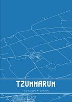 Blauwdruk van de landkaart / plattegrond van de Nederlandse plaats Tzummarum, gelegen in gemeente Waadhoeke, provincie Fryslan. De kaart bevat alle openbare wegen en de coördinaten van het centrum van Tzummarum.