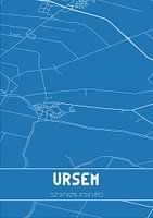 Blauwdruk van de landkaart / plattegrond van de Nederlandse plaats Ursem, gelegen in gemeente Koggenland, provincie Noord-Holland. De kaart bevat alle openbare wegen en de coördinaten van het centrum van Ursem.