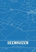 Blauwdruk van de landkaart / plattegrond van de Nederlandse plaats Veenhuizen, gelegen in gemeente Noordenveld, provincie Drenthe. De kaart bevat alle openbare wegen en de coördinaten van het centrum van Veenhuizen.