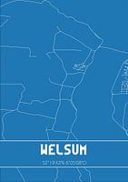 Blauwdruk van de landkaart / plattegrond van de Nederlandse plaats Welsum, gelegen in gemeente Olst-Wijhe, provincie Overijssel. De kaart bevat alle openbare wegen en de coördinaten van het centrum van Welsum.