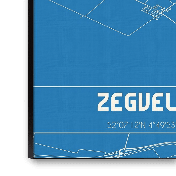 Blauwdruk van de landkaart / plattegrond van de Nederlandse plaats Zegveld, gelegen in gemeente Woerden, provincie Utrecht. De kaart bevat alle openbare wegen en de coördinaten van het centrum van Zegveld.