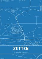 Blauwdruk van de landkaart / plattegrond van de Nederlandse plaats Zetten, gelegen in de Betuwe, in gemeente Overbetuwe, provincie Gelderland. De kaart bevat alle openbare wegen en de coördinaten van het centrum van Zetten.