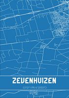 Blauwdruk van de landkaart / plattegrond van de Nederlandse plaats Zevenhuizen, gelegen in gemeente Westerkwartier, provincie Groningen. De kaart bevat alle openbare wegen en de coördinaten van het centrum van Zevenhuizen.