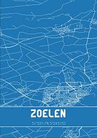 Blauwdruk van de landkaart / plattegrond van de Nederlandse plaats Zoelen, gelegen in de Betuwe, in gemeente Buren, provincie Gelderland. De kaart bevat alle openbare wegen en de coördinaten van het centrum van Zoelen.