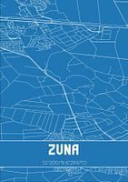 Blauwdruk van de landkaart / plattegrond van de Nederlandse plaats Zuna, gelegen in Twente, in gemeente Wierden, provincie Overijssel. De kaart bevat alle openbare wegen en de coördinaten van het centrum van Zuna.