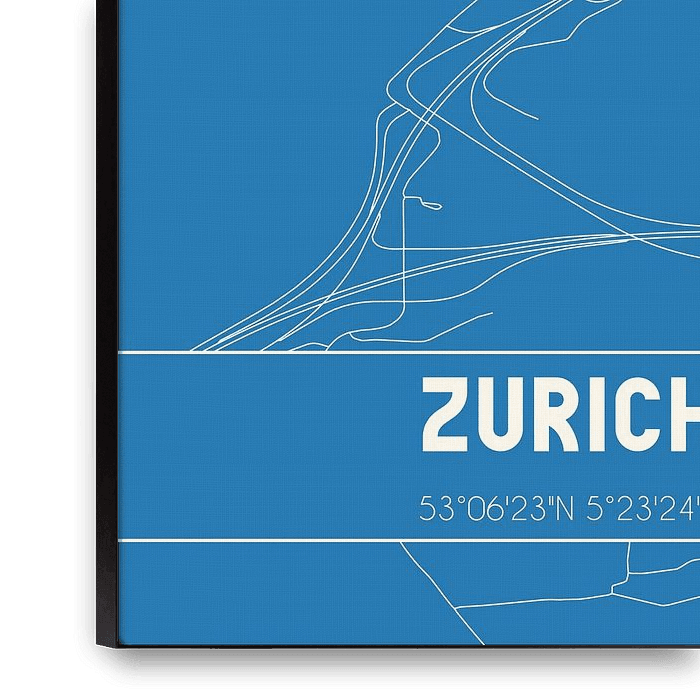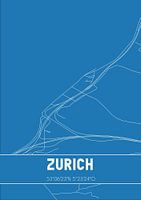 Blauwdruk van de landkaart / plattegrond van de Nederlandse plaats Zurich, gelegen in gemeente Sudwest-Fryslan, provincie Fryslan. De kaart bevat alle openbare wegen en de coördinaten van het centrum van Zurich.